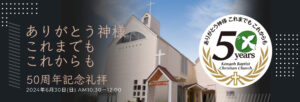 神の祝福によって、私たちの教会は設立から50周年を迎えました。神がなされた御業を何一つ忘れることなく、その恵みの数々を覚えて感謝し、次世代に語り伝えてさらなる50年の恵みを祈り求める礼拝をおささげします。金剛バプテスト・キリスト教会を共にたてあげてくださったお一人おひとりに感謝し、共に礼拝をおささげしましょう。